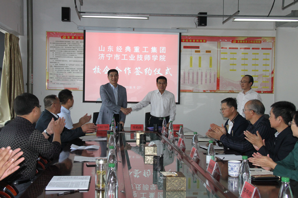 9月27日上午,在濟寧工業技師學院三樓會議室,濟寧工業技師學院黨委書記王純民與山東經典重工集團股份有限公司董事長苗樹文就培養應用型技術工人、促進勞動力就業、深化相互合作等共同簽訂校企合作協議。