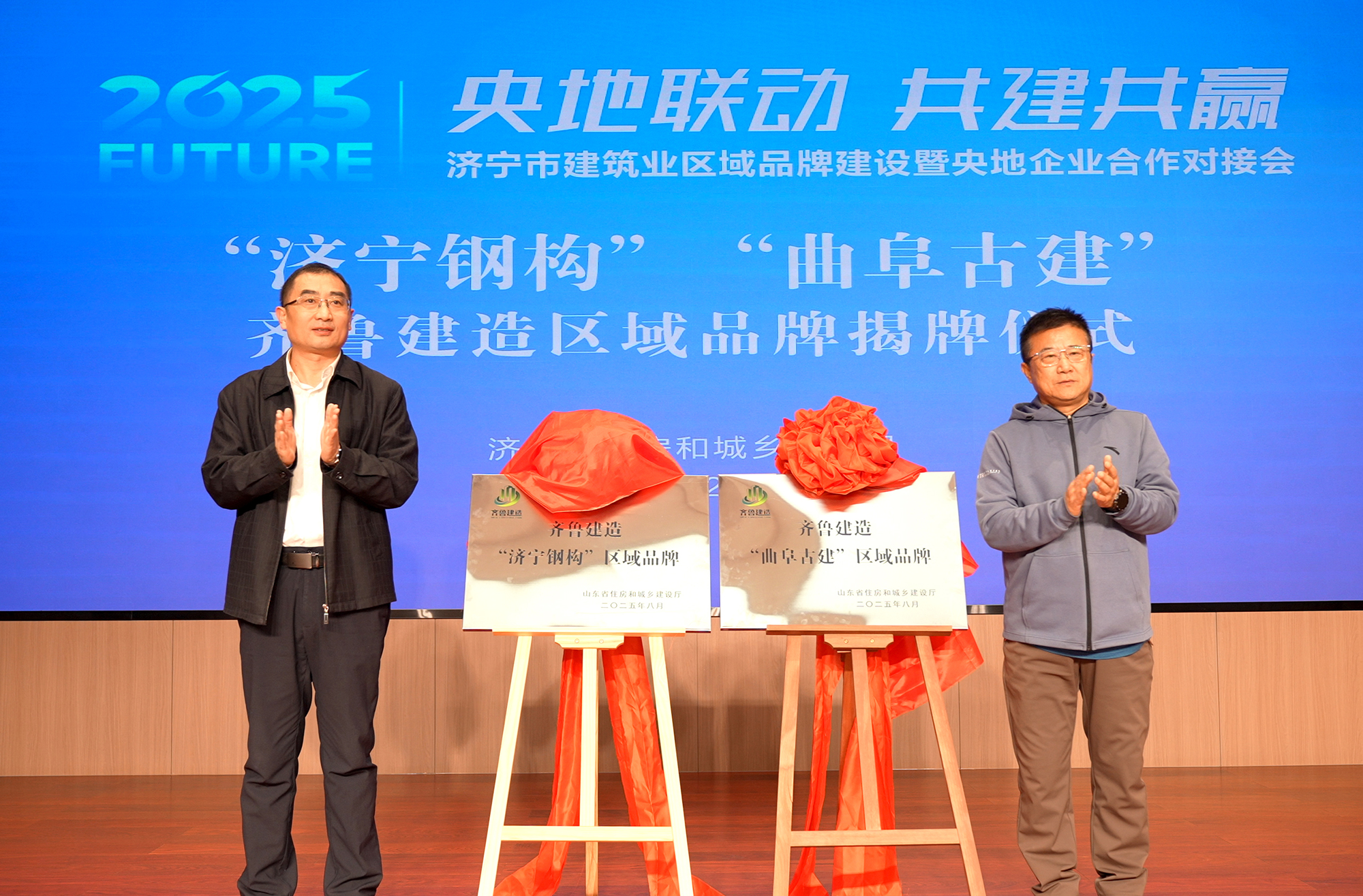 市住建局李振副局長、市建筑業(yè)協(xié)會郭志明會長共同為“濟(jì)寧鋼構(gòu)”“曲阜古建”齊魯建造區(qū)域品牌揭牌
